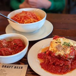was looking forward to eating pizza here for the last 3 weeks. got here and realized I was thinking of another restaurant lmaooo. we got the eggplant parm and a margherita pizza. pizza was pretty good. they unfortunately didn't have a cheesed out atherosclerosis-causing pizza but they do sell a block of mozzarella if you need it so that's good. the eggplant parm was very good tho maybe a 10/10. it was like eggplant lasagna with mozzarella I can't wait to have it again. our two items made a nice lunch for two people. that was the review for patrons here's my review for management: leaving extra plates on the tables all day is gross. passerby, or a fly, can touch them or drop stuff on them. if a person isn't being paid hourly to touch my plates or stand weirdly close to my plate I would rather they not lol. also 3 of the plates next to me were still wet from drying rack or they had crust on them. my glass also had crust. good eggplant parm tho. ambiance meh. would be a nice chill spot for the family after church or something like that.